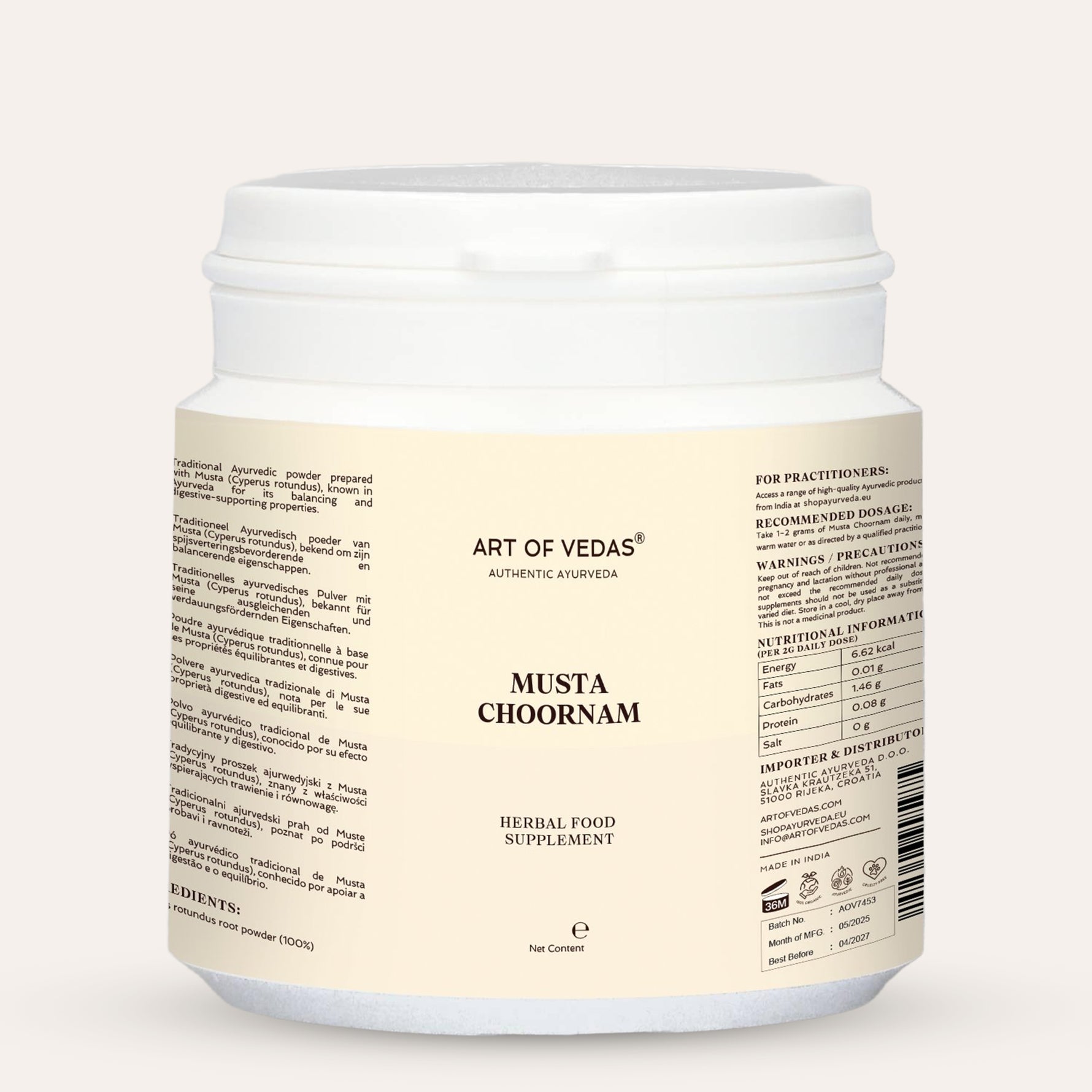 Unit price perMusta Choornam is a classical Ayurvedic powder prepared from the rhizome of Cyperus rotundus, a revered herb known for its deep action on the digestive fire (Agni) and Pitta dosha. Traditionally used in postnatal care, children’s wellness, and Pitta conditions, it is a gentle and effective formulation prepared according to classical Ayurvedic methods.